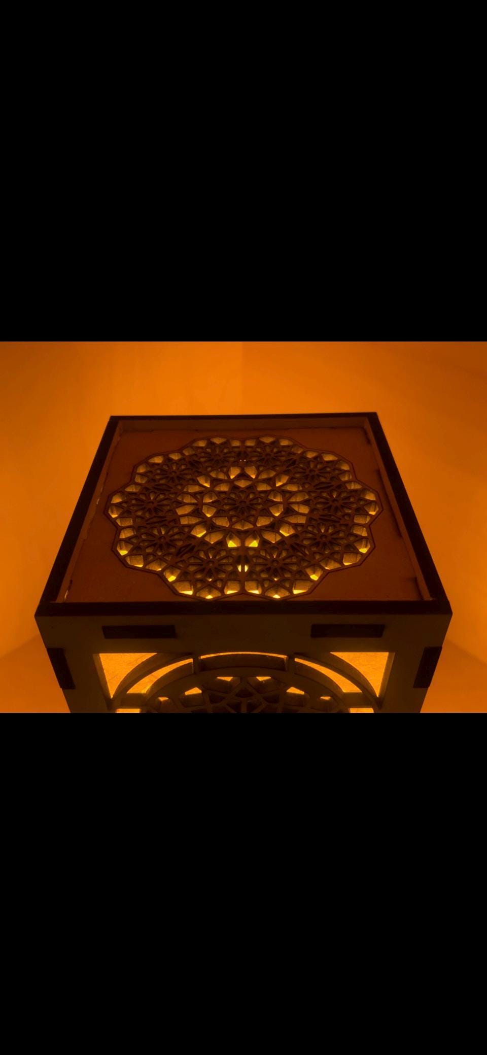 The top panel includes coordinated cutwork for both ventilation and light diffusion, allowing glow to escape upward while maintaining the integrity of the form. All structural components are sealed prior to assembly to enhance durability and surface stability.