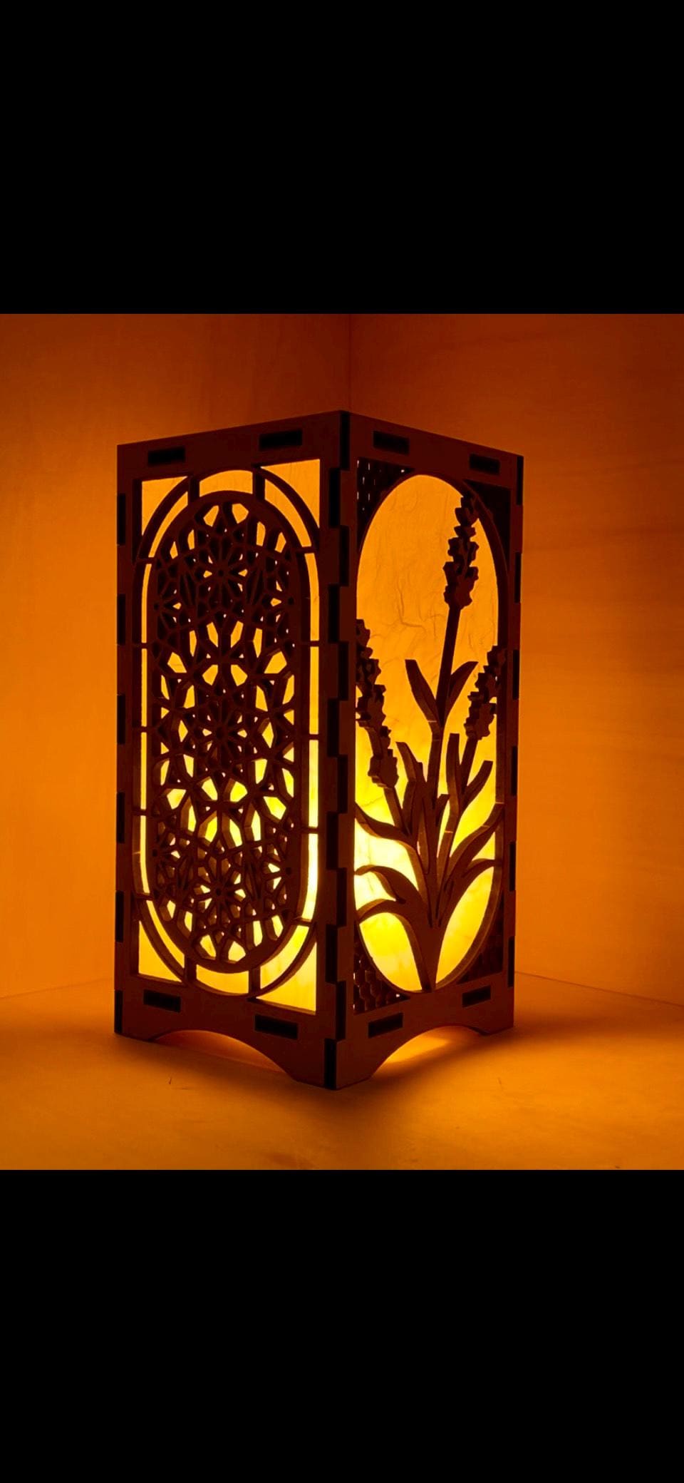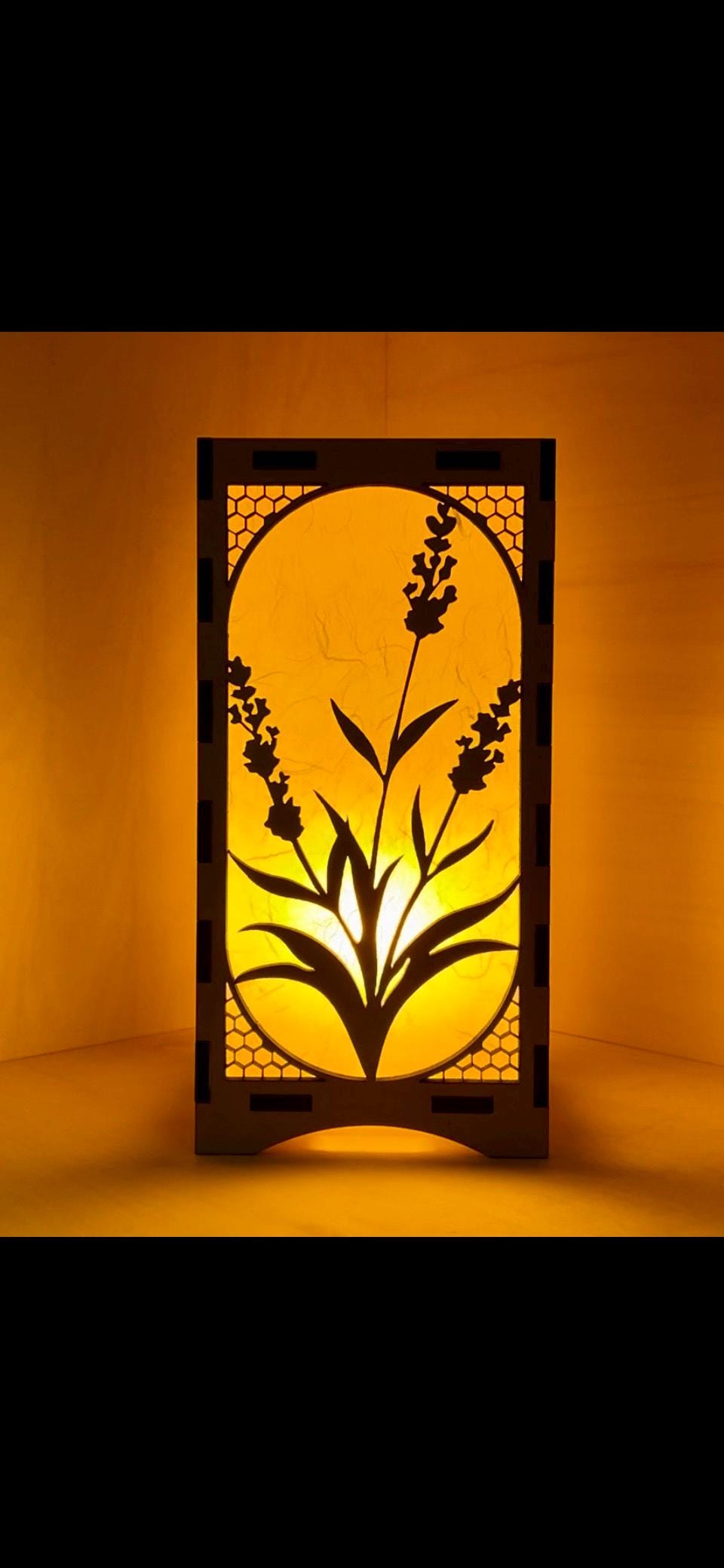 The lantern is constructed from precision-cut 1/4" engineered wood. Each of the four structural side panels is laser-cut and backed with Unryu “cloud dragon” paper — a translucent mulberry-fiber paper whose visible strands become animated when backlit. Two opposing panels feature the primary motif of the design, while the remaining two panels introduce a complementary geometric or patterned element, creating visual balance from every angle.
